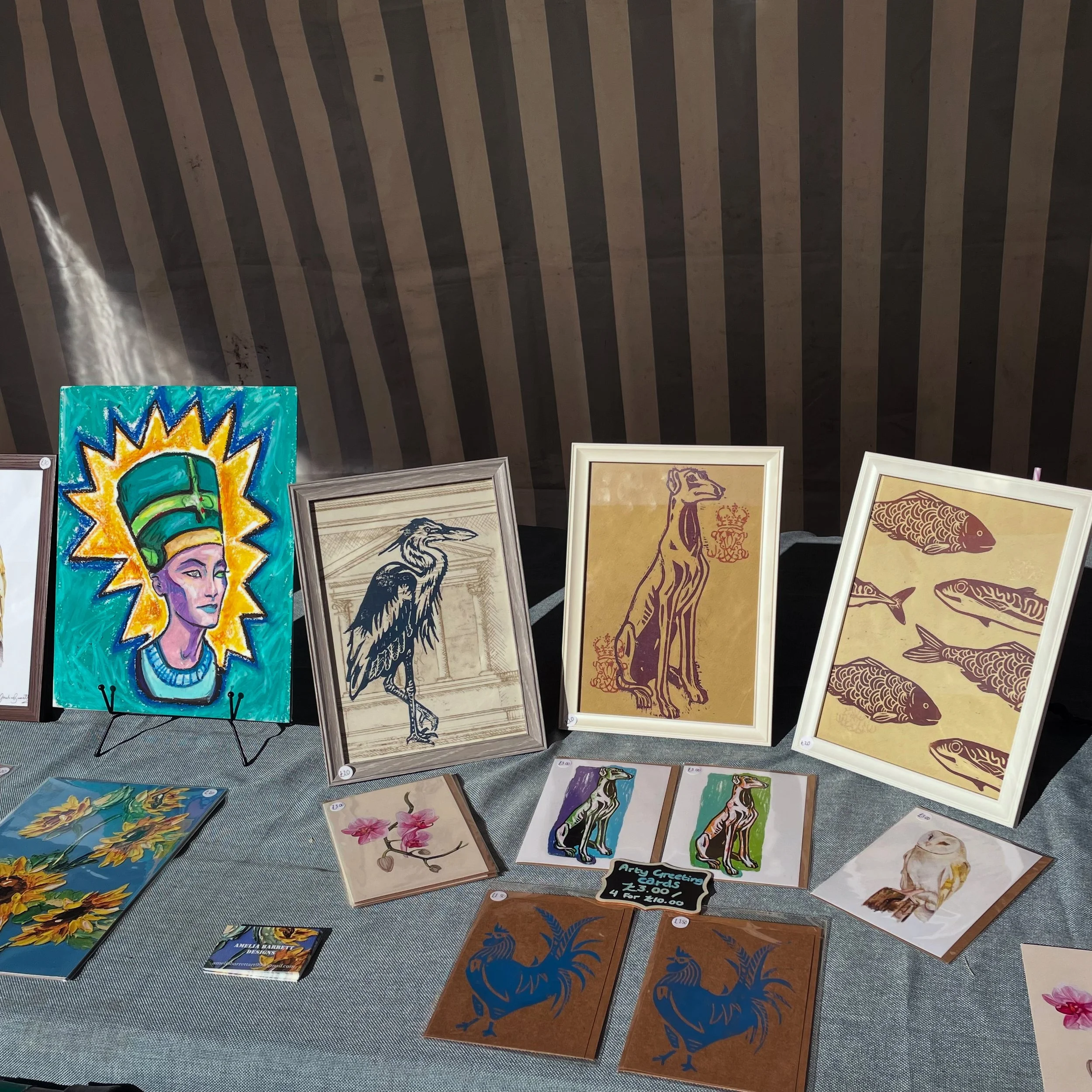 I attend Grantham’s Saturday Market as much as I can. I display and sell my work in a variety of different ways. Such as A4 prints, A5 greeting cards, cotton vegan tote bags, recycled printed vinyls and printed lino cards/ prints.